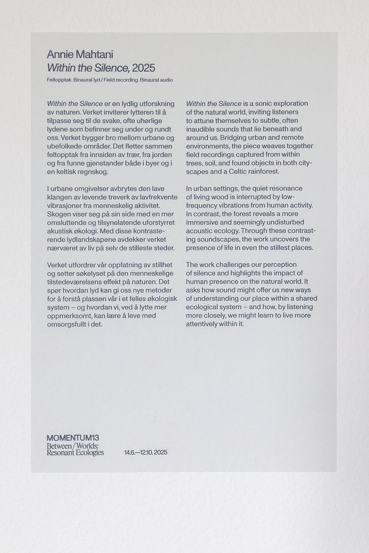 Annie Mahtani. Within the Silence, 2025. Installation view at MOMENTUM 13. Photo: Eivind Lauritzen © 2025 Galleri F 15.