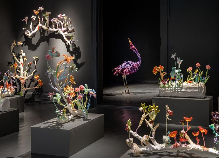 Installation view: "The Soft Spot" (2021) + "The Enchanted Garden" (2024). From the exhibition «Death or Eternal Delight» by Nathalie Djurberg & Hans Berg, 8 March - 25 May 2025 at Galleri F 15, Moss, Norway. Photo by: Eivind Lauritzen, Galleri F 15.